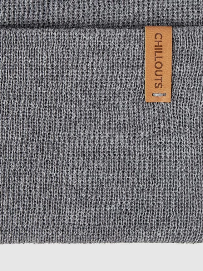 Die Beanie von CHILLOUTS ist aus einer Merinowollmischung gefertigt und doppellagig verarbeitet. Sie zeigt sich mit Umschlag und Label-Patch.