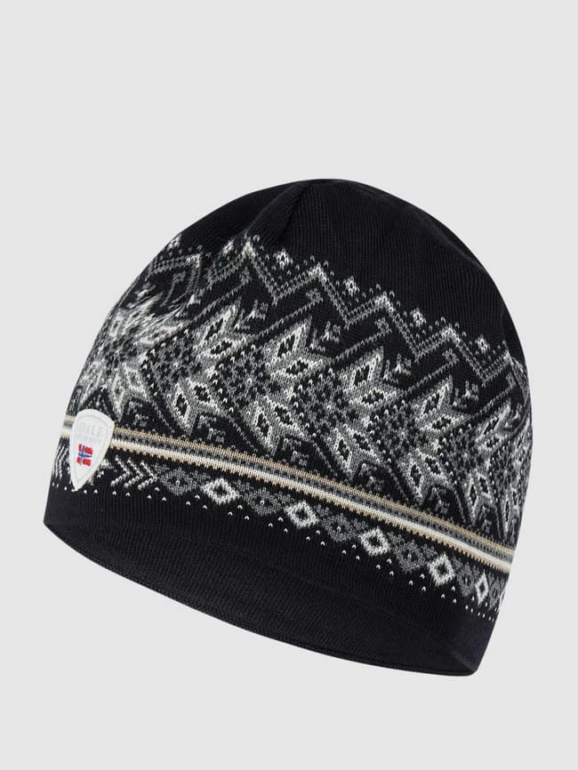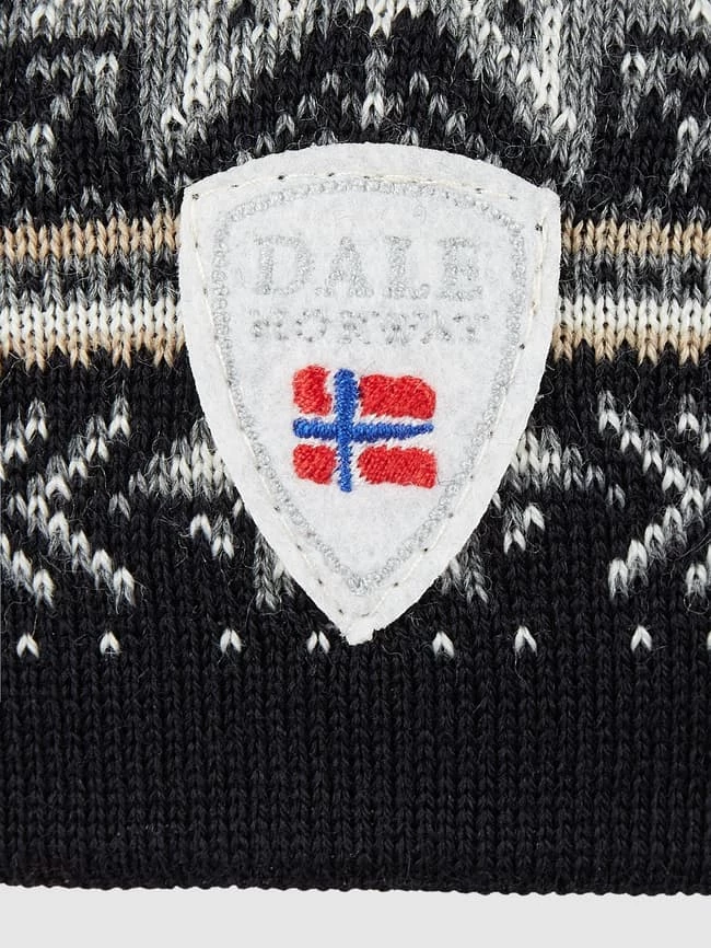 Die Mütze von Dale of Norway ist aus reiner Merinowolle gefertigt. Sie zeigt sich mit eingestricktem Muster und Logo-Aufnäher.