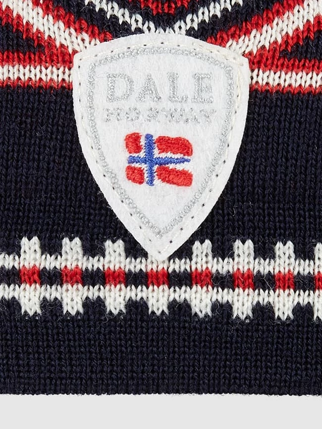 Die Mütze von Dale of Norway ist aus reiner Merinowolle gefertigt. Sie zeigt sich mit eingestricktem Muster und Logo-Aufnäher.