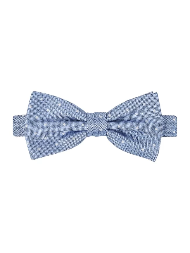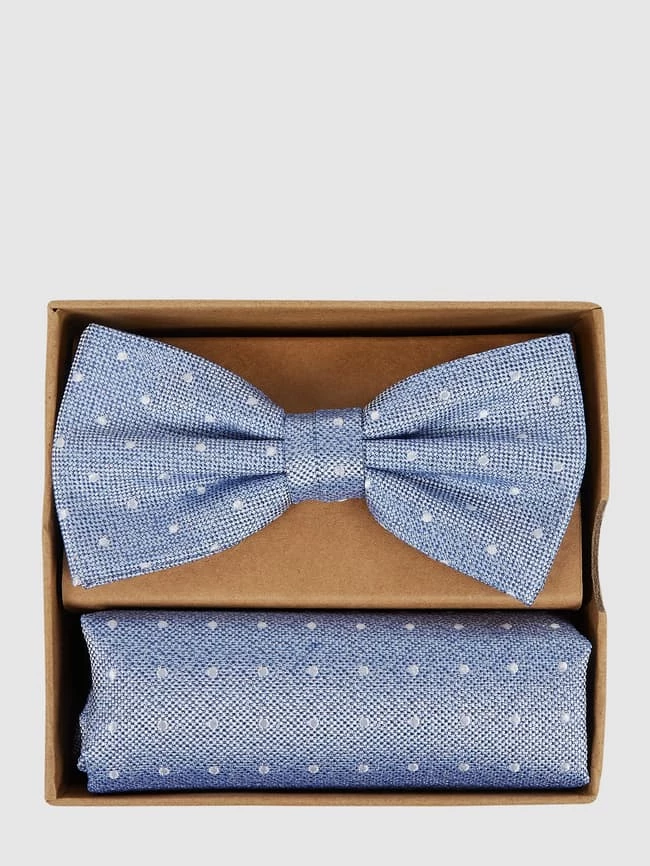 Die Fliege von Prince Bowtie ist aus reiner Seide gefertigt und zeigt sich mit Punktmuster. Sie ist vorgebunden und kommt im Set mit einem Einstecktuch.