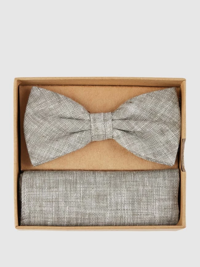 Die Fliege und das Einstecktuch von Prince Bowtie sind aus Leinen gefertigt. Die Fliege ist vorgebunden und in der Weite verstellbar.