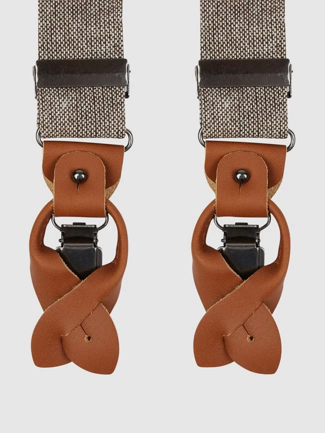 Die Hosenträger von Prince Bowtie sind aus einer Materialmischung mit Woll-Anteil gefertigt und in Y-Form gehalten. Sie kommen im Set mit einer vorgebundenen Fliege.