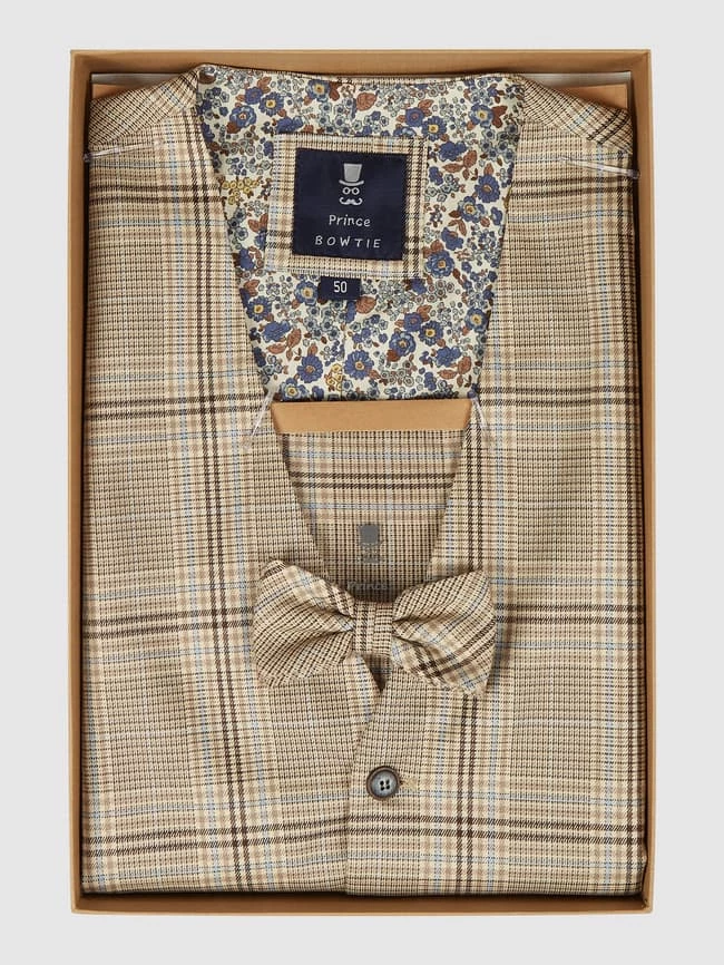 Die Weste von Prince Bowtie ist aus einer Materialmischung mit Viskose-Anteil gefertigt und gerade geschnitten. Sie zeigt sich mit Glencheck, verstellbarem Riegel und Leistentaschen. Das Modell kommt im Set mit einer Fliege und einem Einstecktuch.