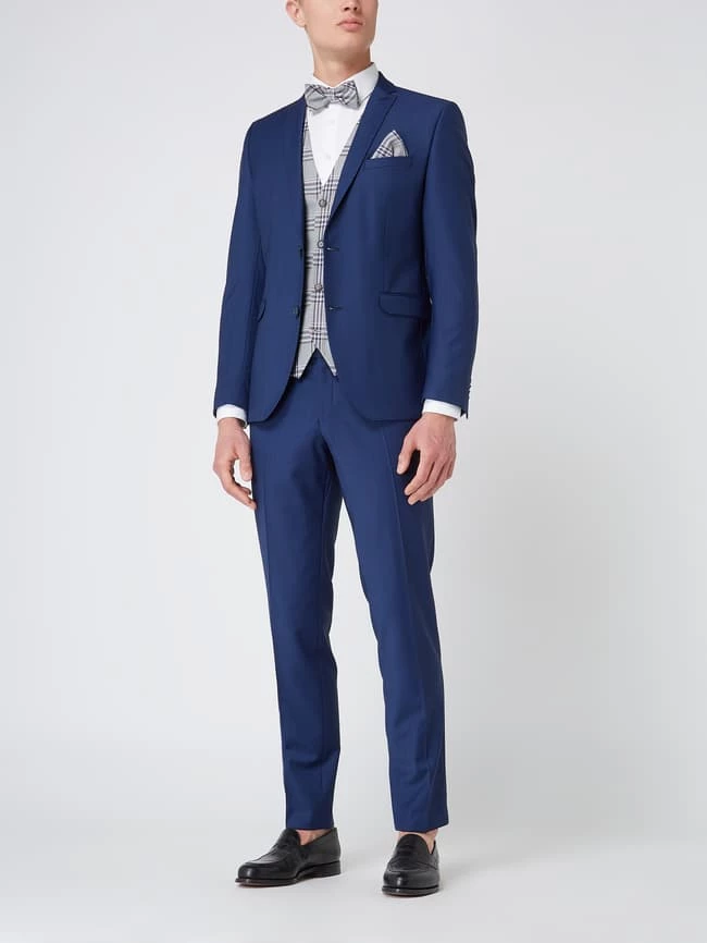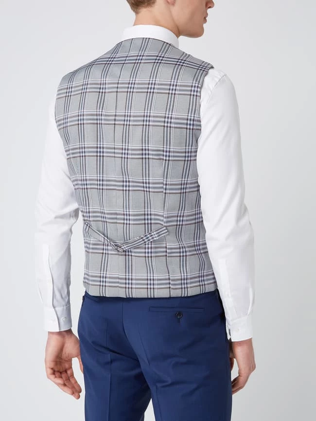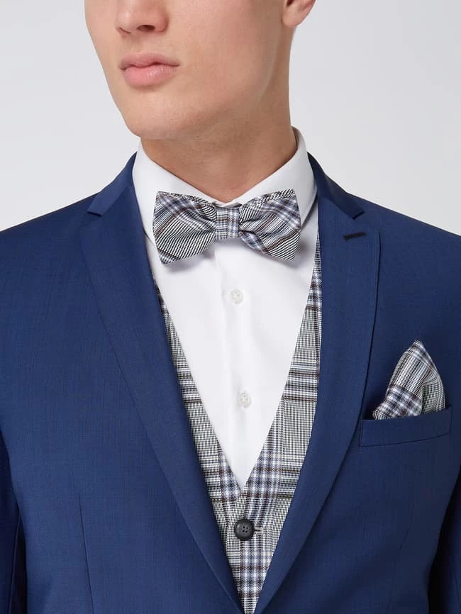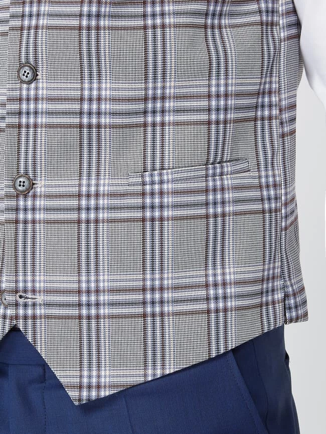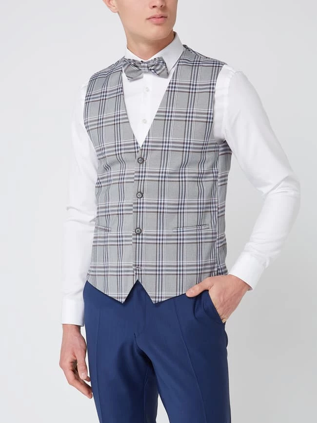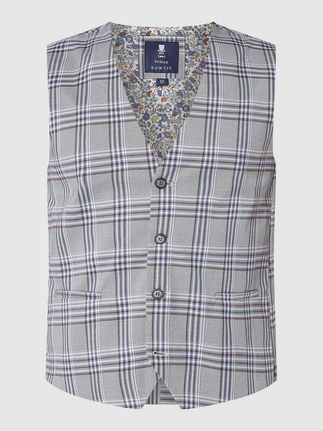 Die Weste von Prince Bowtie ist aus einer Materialmischung mit Viskose-Anteil gefertigt und gerade geschnitten. Sie zeigt sich mit Glencheck, verstellbarem Riegel und Leistentaschen. Das Modell kommt im Set mit einer Fliege und einem Einstecktuch.