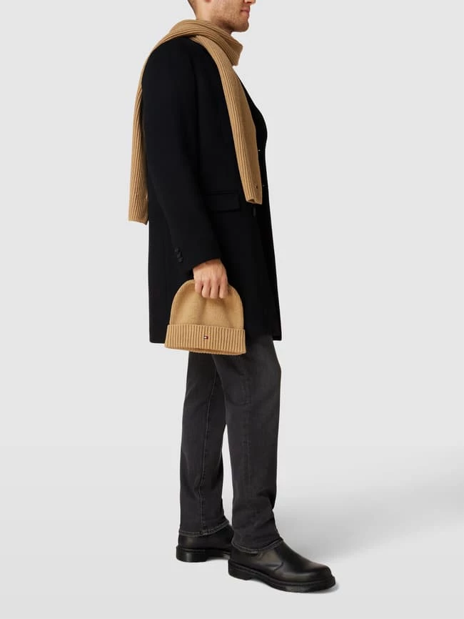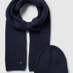 Die Mütze von Tommy Hilfiger ist aus einem Baumwoll-Elasthan-Mix gefertigt. Sie kommt in Strick-Optik mit Label-Stitching, breitem Umschlag und Schal im Set.
