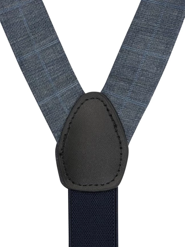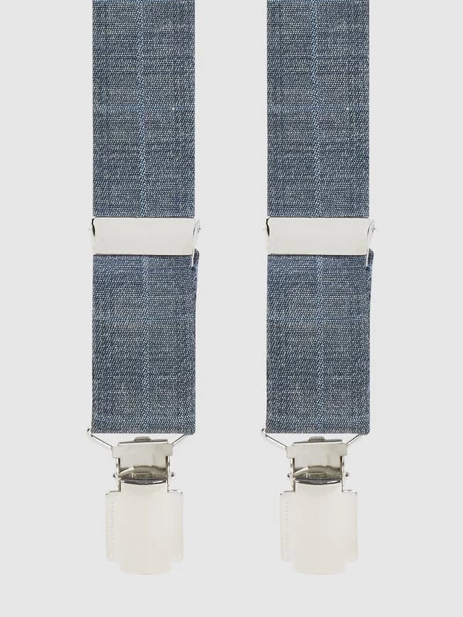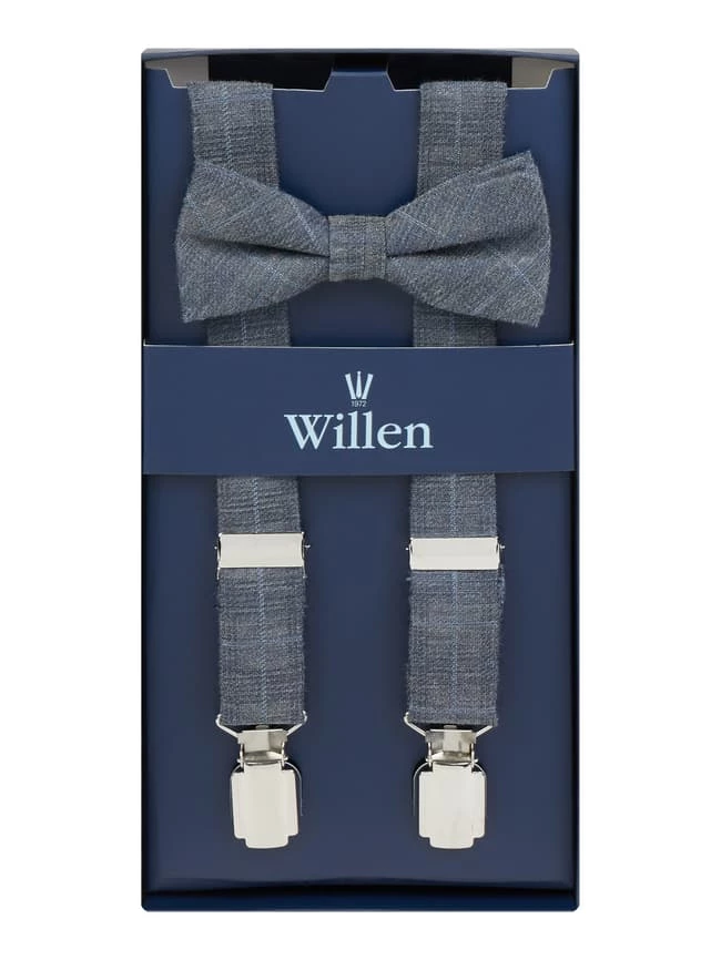 Die Fliege und der Hosenträger von Willen sind aus einer Baumwollmischung gefertigt. Die Fliege ist vorgebunden und in der Weite verstellbar. Der Hosenträger kommt in Y-Form mit Clips aus Metall.