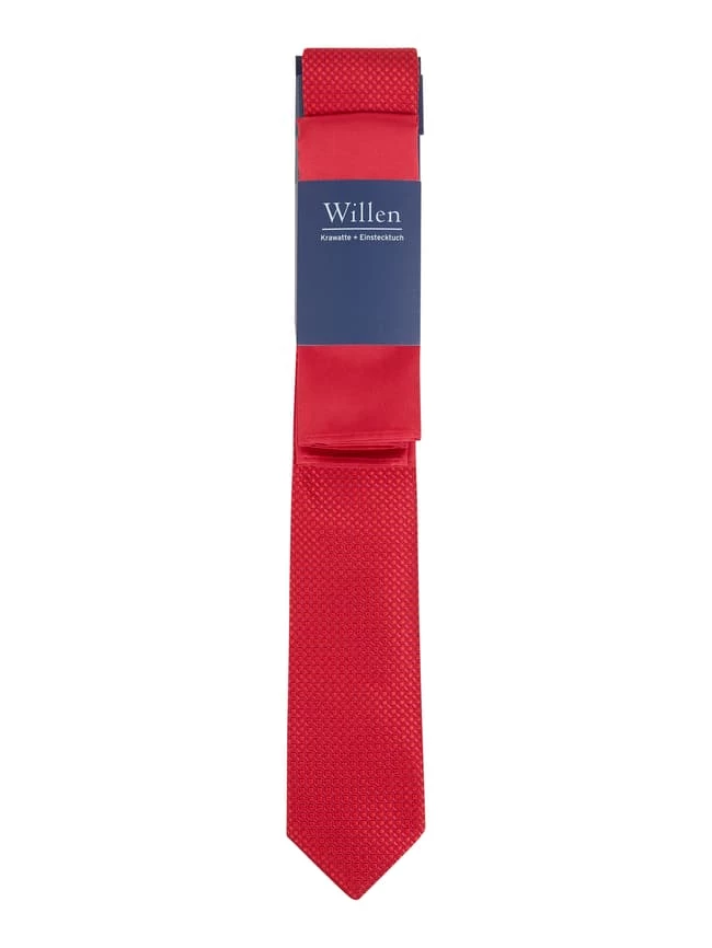 Die Krawatte und das Einstecktuch von Willen sind aus einer Seidenmischung gefertigt. Die Krawatte kommt mit strukturiertem Webmuster, das Einstecktuch ist unifarben.