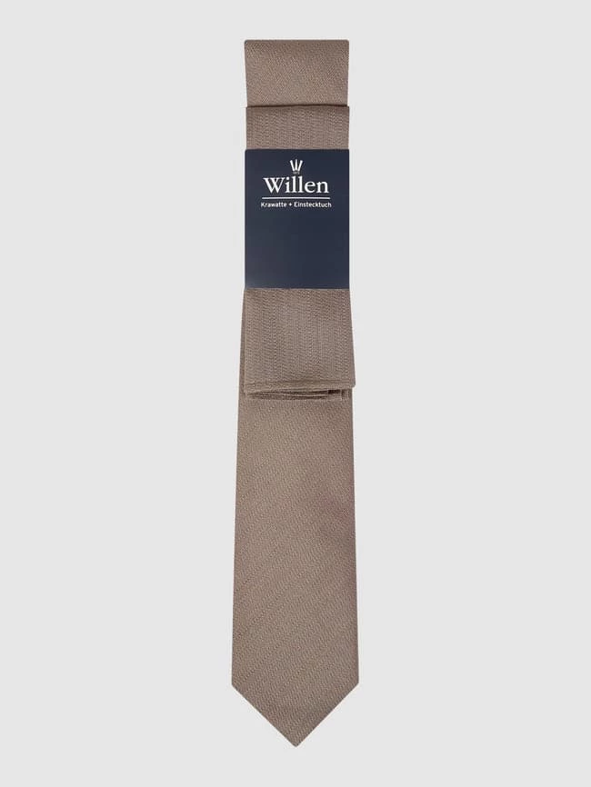 Die Krawatte und das Einstecktuch von Willen sind aus reiner Seide gefertigt. Sie zeigen sich mit strukturiertem Muster.